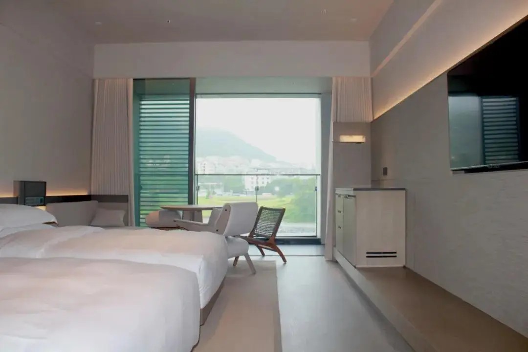 设计以山水为依托,构建「水可鉴心,山能养志」的精神归宿。取材金属格栅、中空玻璃、清水混凝土和当地石材,以「减法设计」凸显材质本真。