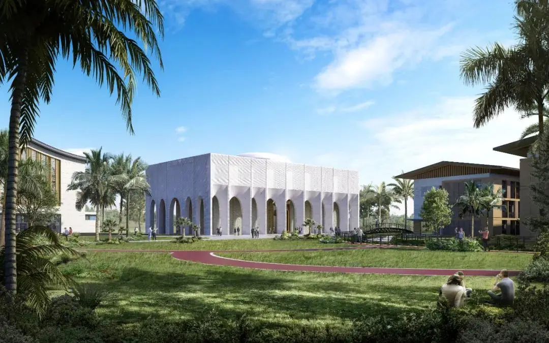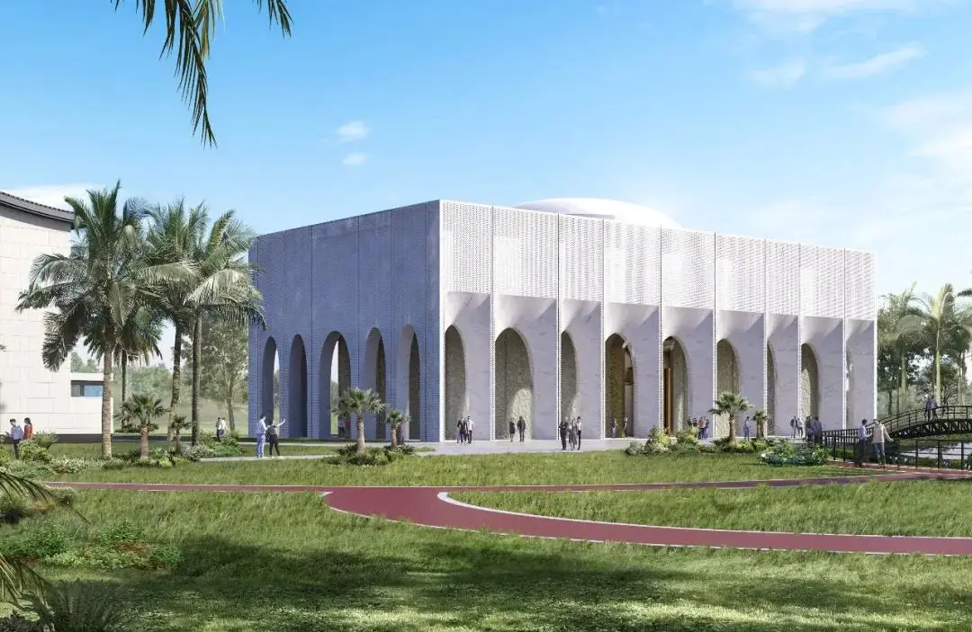 当地伊斯兰教众多,清真寺的设计遵循了伊斯兰宗教的教义,符合穆斯林的风俗习惯。清真寺靠近场地水系设置,且建筑朝向和朝拜方向都指向麦加,远离中国宿舍区域,以免影响员工休息。