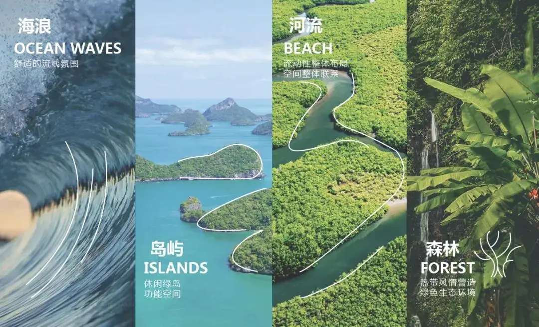 景观设计旨在打造“热带雨林里的活力国际园区”。以场地自然资源为基底,根植于印尼独特的文化气质、自然景观和城市精神,采用“自然流淌,绿色渗透”的设计思路,建造了一个包含休闲花园、森林岛屿、滨河景观和休闲海岸的交互式公共场域。