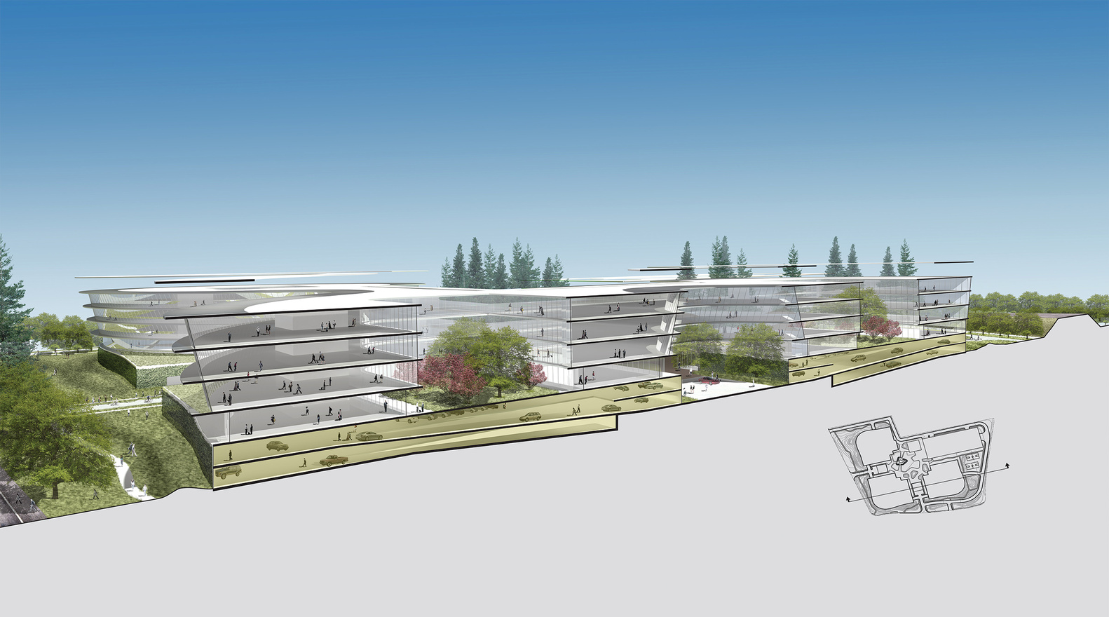 最初,客户要求将建筑位于场地的北端,以避开现有的建筑,项目发展到创造一个更长、更灵活的南北方向的办公楼板,使每个立面有更多的光线和景观,并创造一个新的公共庭院。原有的地面运动场被迁移到停车场子结构上,以便实现场地战略。