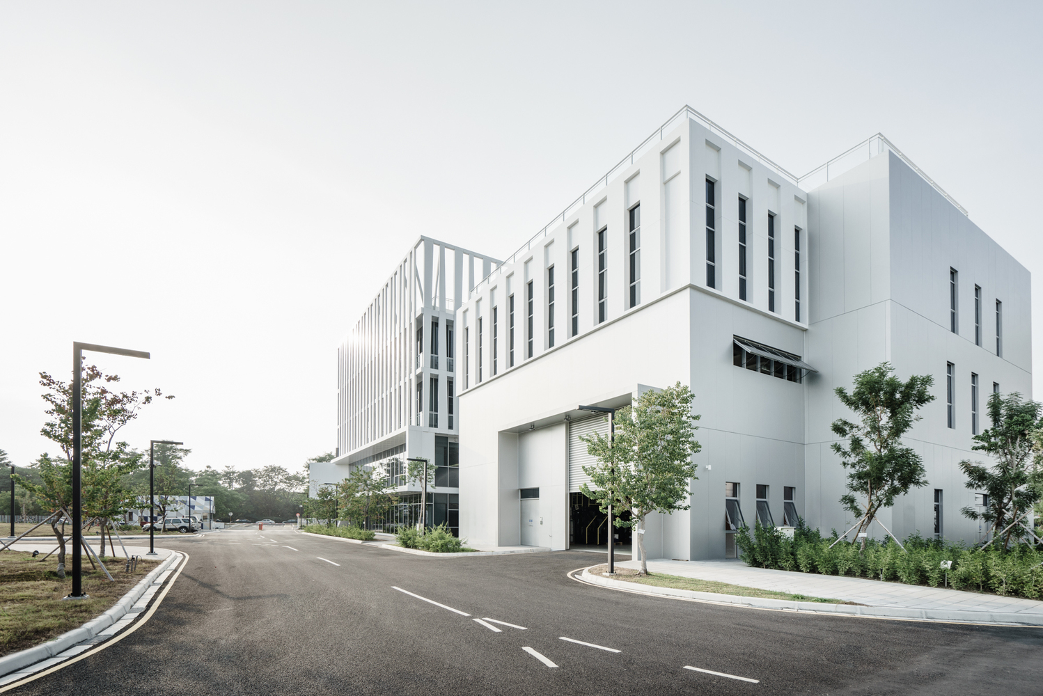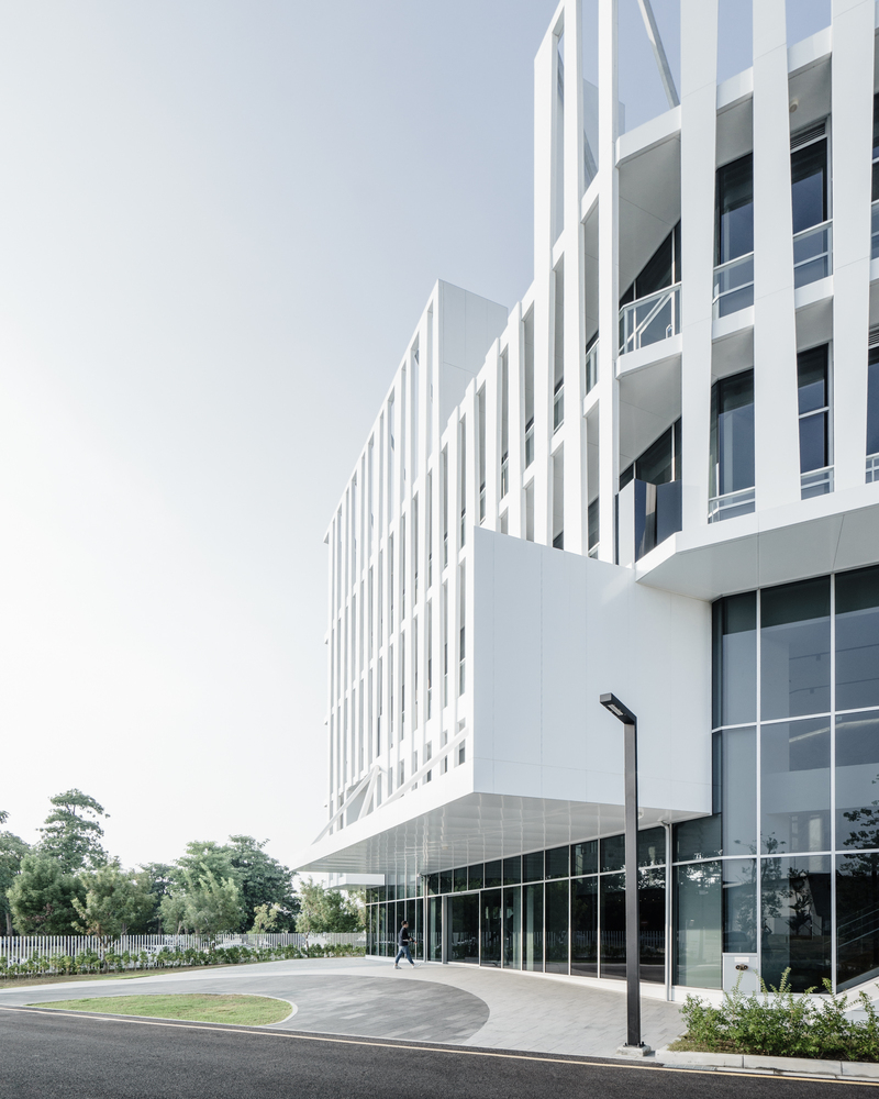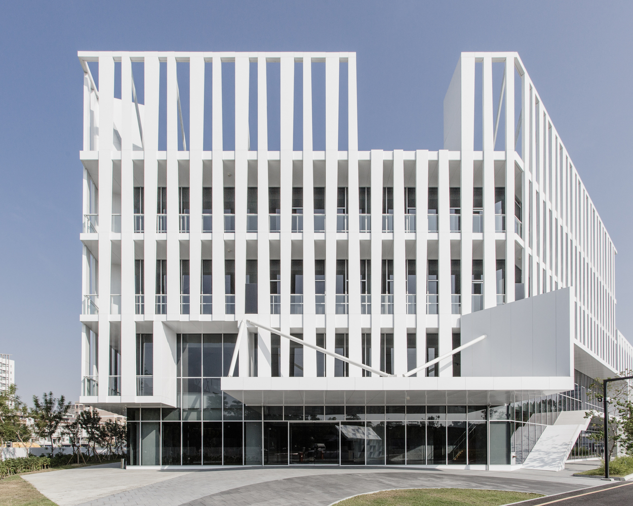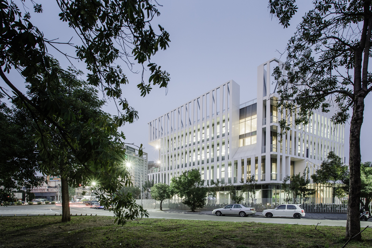 为响应缺乏核心及密度的都市环境,以及基地涵构的破碎性及变动性,本案采用清晰紧凑的五边形量体作为建筑形式,以五向立面的正面性(Frontality)为周边的都市经验提供锚定的透视效果。外壳材料为单一均质的高反射率白色铝板,但以双层墙的方式构筑,让立面虽简单却带有深度及重量,向基地外投射Facade的影响力。