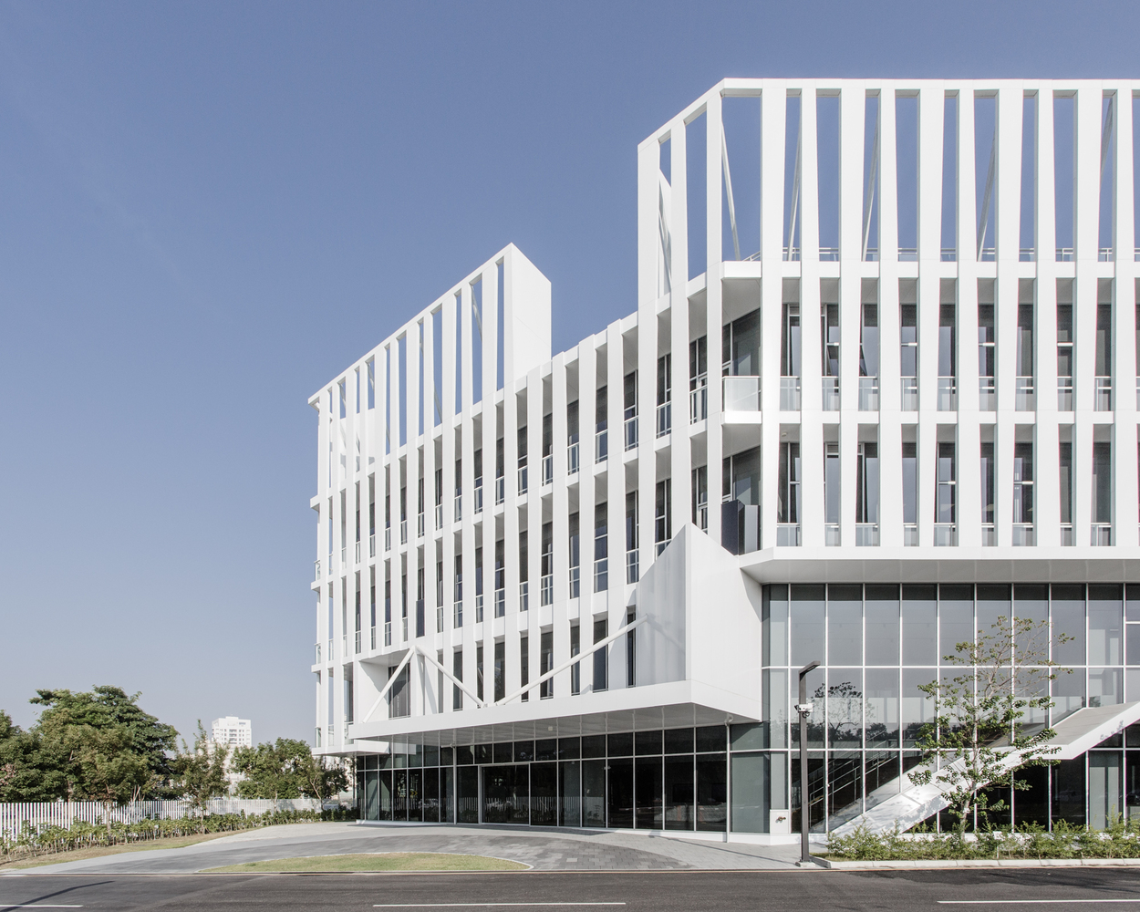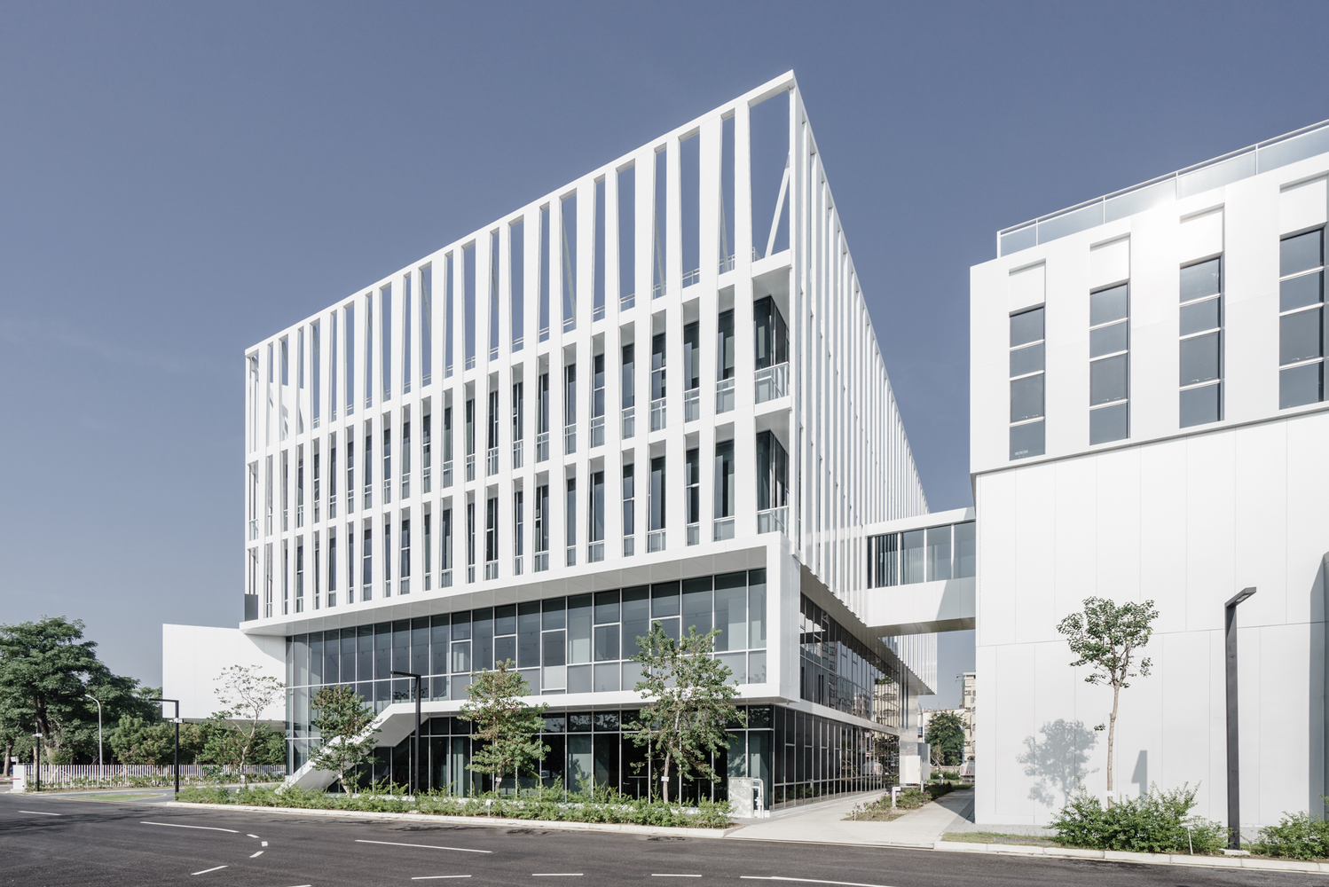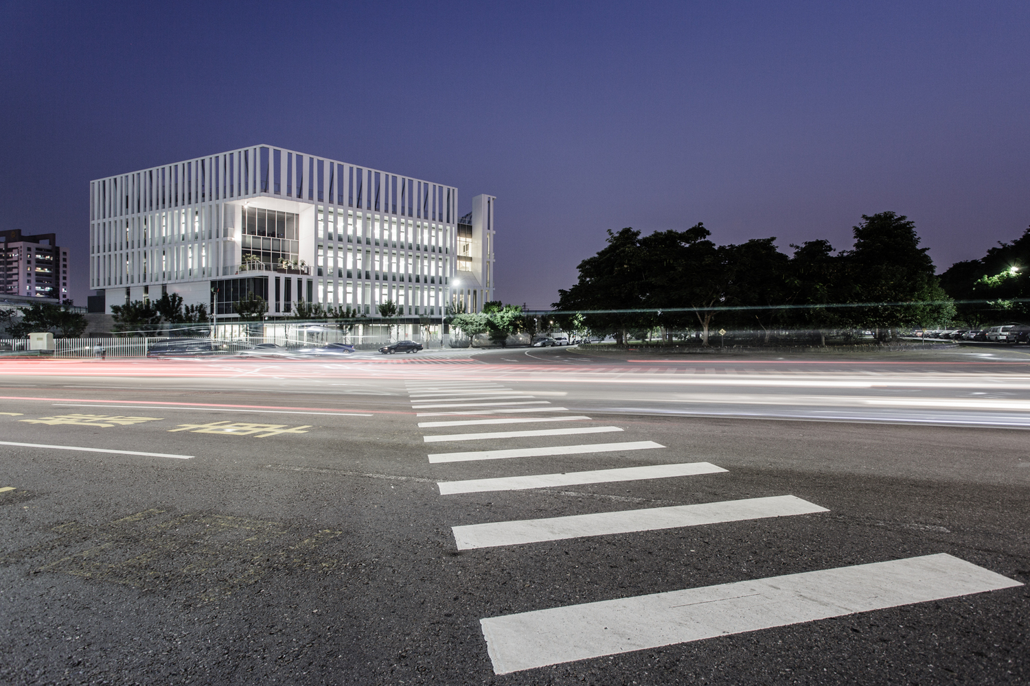 为响应缺乏核心及密度的都市环境,以及基地涵构的破碎性及变动性,本案采用清晰紧凑的五边形量体作为建筑形式,以五向立面的正面性(Frontality)为周边的都市经验提供锚定的透视效果。外壳材料为单一均质的高反射率白色铝板,但以双层墙的方式构筑,让立面虽简单却带有深度及重量,向基地外投射Facade的影响力。