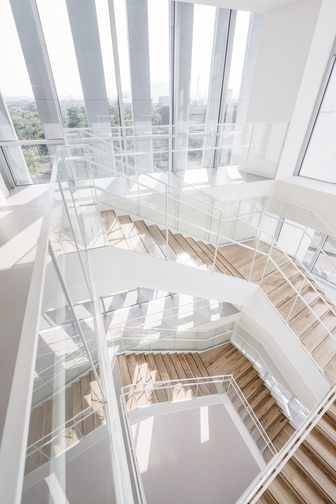 其次,本案的动线刻意“降低效率”,环形走廊增加环绕着中庭及天井移动的时间,作为个别研究室与集体空间的中介,创造不期而遇的机会。不同于一般建筑集中、挑高、具有自明性的大厅,本案的大厅被设计转化成一连串延长的空间,其中存有大型楼梯、过道、曲折的垂直动线,从入口至上层中庭一路进行空间的转换。藉由在建筑内部的空间回游,增加空间层次,作为与外部零碎、扁平化都市环境的对比。