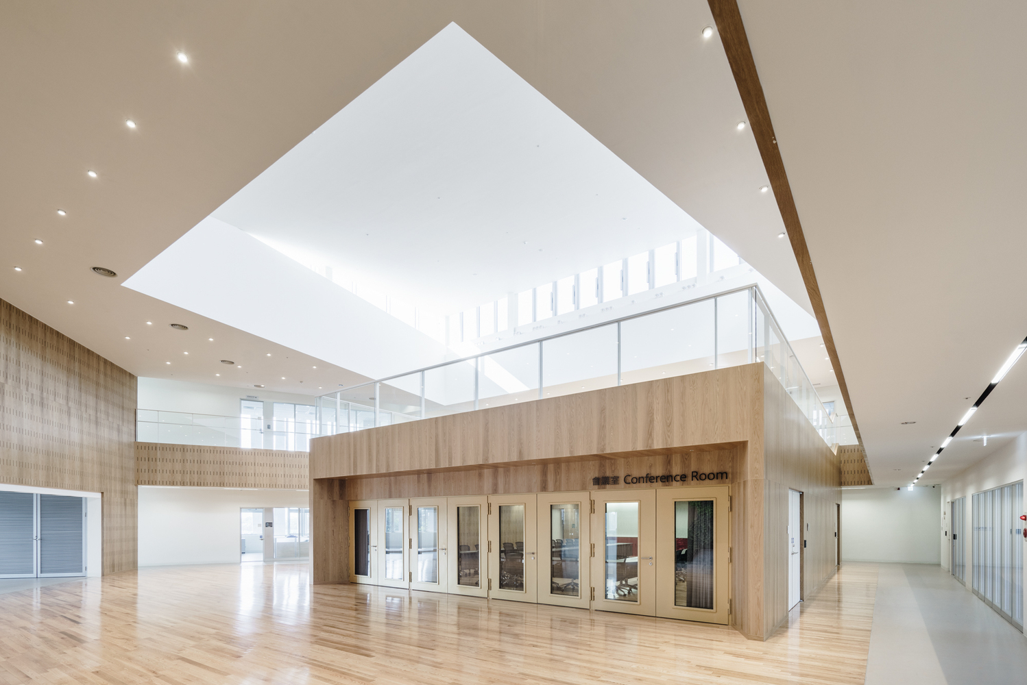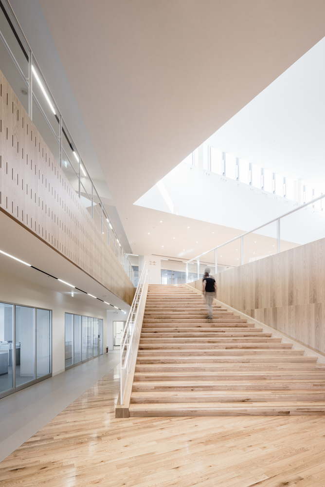 上面两层办公室则环绕开放的“阳光中庭”,其中置入大型阶梯、高科技会议室、以及不同高度的平台,提供不同的交流使用体验。藉由外部立面及外圈办公室的冷白色调与内部集体空间的温暖实木板的对比,凸显数字时代研究机构中集体性、策展式的弹性使用的重要地位。冲孔实木所造成的视觉、听觉、嗅觉、触觉感受意在激发数字时代所欠缺的身体存在感,以材料与中庭类型的亲密感一起响应“鸟巢”意象,作为育成中心的象征。