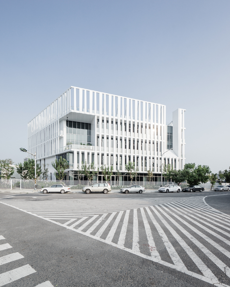 首先,设计师赋予本案的建筑形式是鸟巢般的建筑类型,周边一整圈是传统的研究室,环绕着向心的中央挑空。四层楼的建筑被分为两个层次:下面两层研究室围绕着中央封闭式的“深色天井”,这是不采光的多功能大型会议厅,可作为会议、展示、发表产品使用。