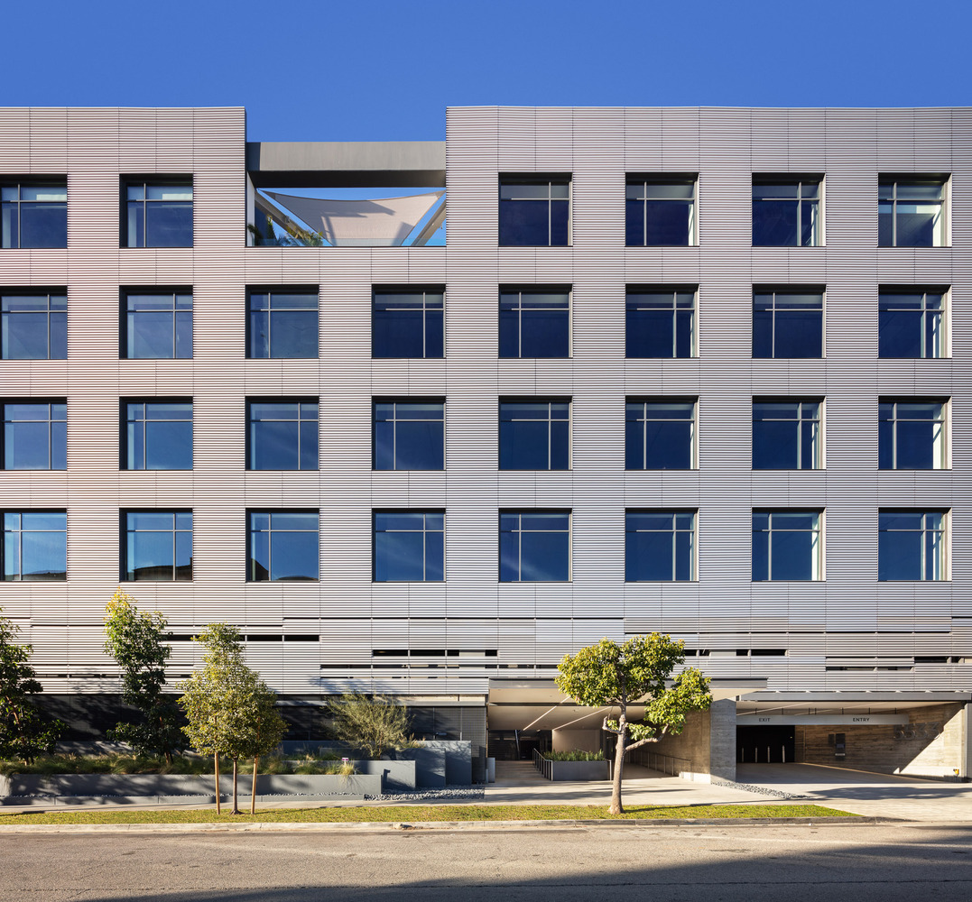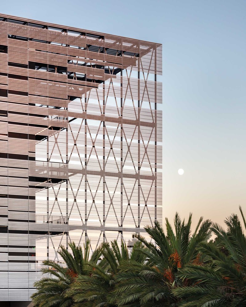 该项目最鲜明的特点之一:一个“漂浮”的、有孔的表皮,笼罩在建筑的外部。灵感来自于水面上的光影,并受到 Ellsworth Kelly 和 Agnes Martin 的不均匀的自然几何形状的影响,表皮被设计成去物质化的,在视觉上减轻了结构的重量,同时在功能上为玻璃幕墙提供了遮挡阳光的作用。自然光从各个方向温和地过滤进来,并按比例分布在整个室内表面区域。