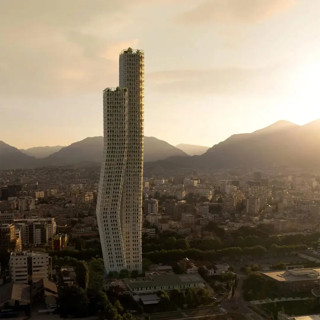 塔楼相互弯曲,向对方倾斜,形如“芭蕾舞”优雅的姿态。建筑的参数化结构反映了阿尔巴尼亚地毯的传统图案,在外立面上创造了独特的纹理。就像舞者将精确度融入每一个动作,这座建筑将地拉那历史和文化编织成一幅反映城市不断演变身份的挂毯。