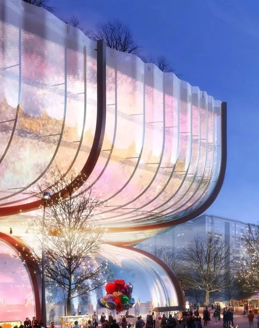 两座建筑都采用了双层表皮,在提供更好的可持续性的同时,也为艺术展览和活动提供了场地。建筑外部的水晶玻璃在白天闪闪发光,给人一种柔和的印象。到了晚上,外表皮则成为发光投影的幕布,充满生机。