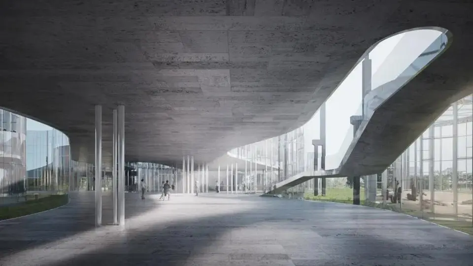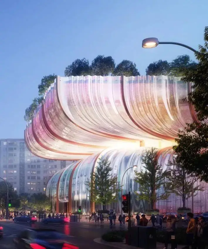 温室花园设计结合了旧钢铁车间的历史元素与现代设计理念。透明玻璃幕墙提供自然光,流线型结构使建筑轻盈如漂浮。钢铁与玻璃、直线与曲线的对比体现了“阴阳”思想,建筑顶部的绿色植被层有效隔热,减少能源消耗。