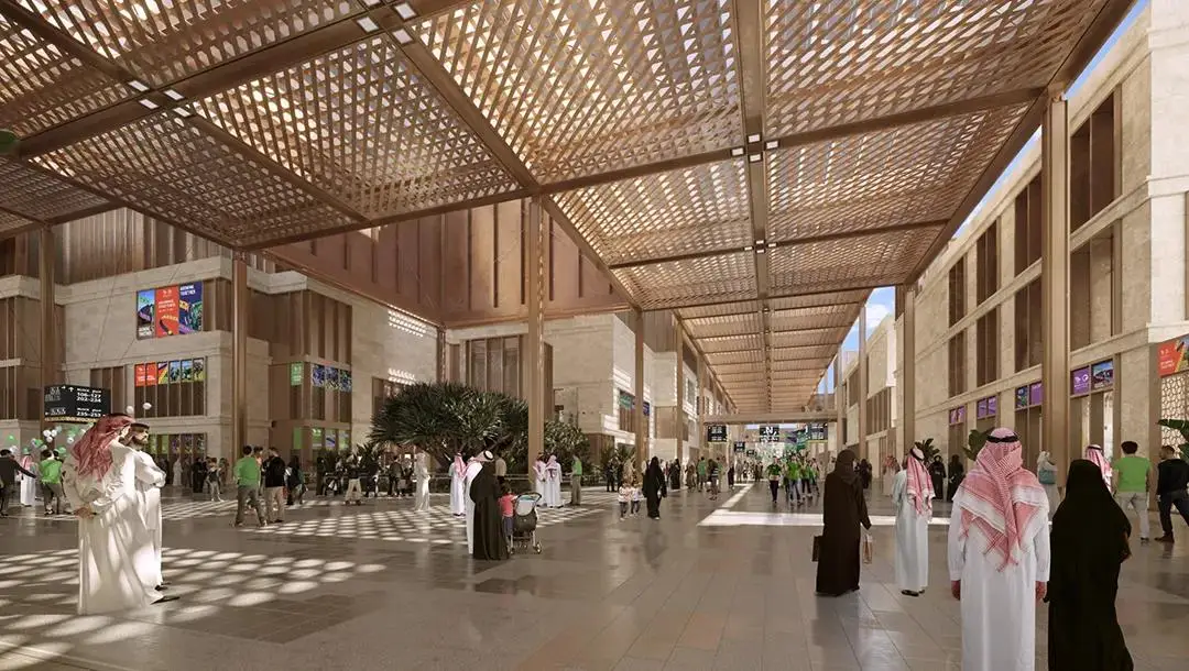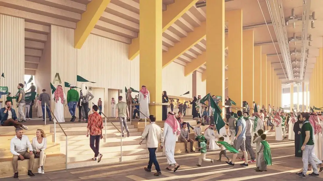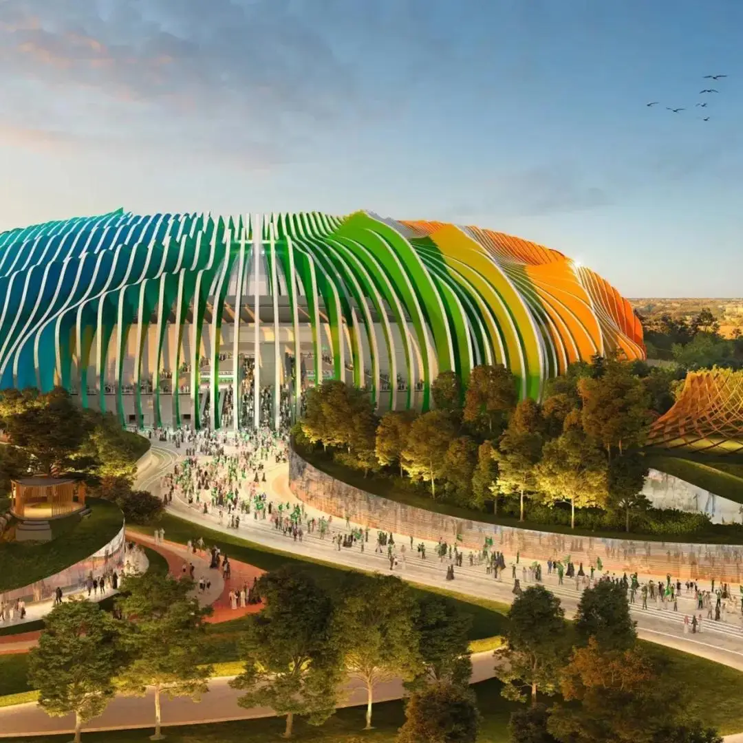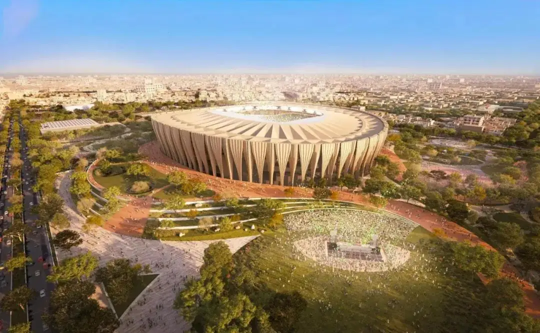 南利雅得体育场,位于沙特首都南部。它将被无数红褐色的垂直鳍片包裹,顶部是透明的屋顶。体育场预计可容纳超过45,000名观众,其设计灵感来源于Salmani建筑风格,场馆外立面将现代感与当地建筑语言及色彩融为一体。同时,体育场的设计还考虑了可持续发展原则,使用雨水收集系统和太阳能电池板,可减少用水量并产生可持续能源。