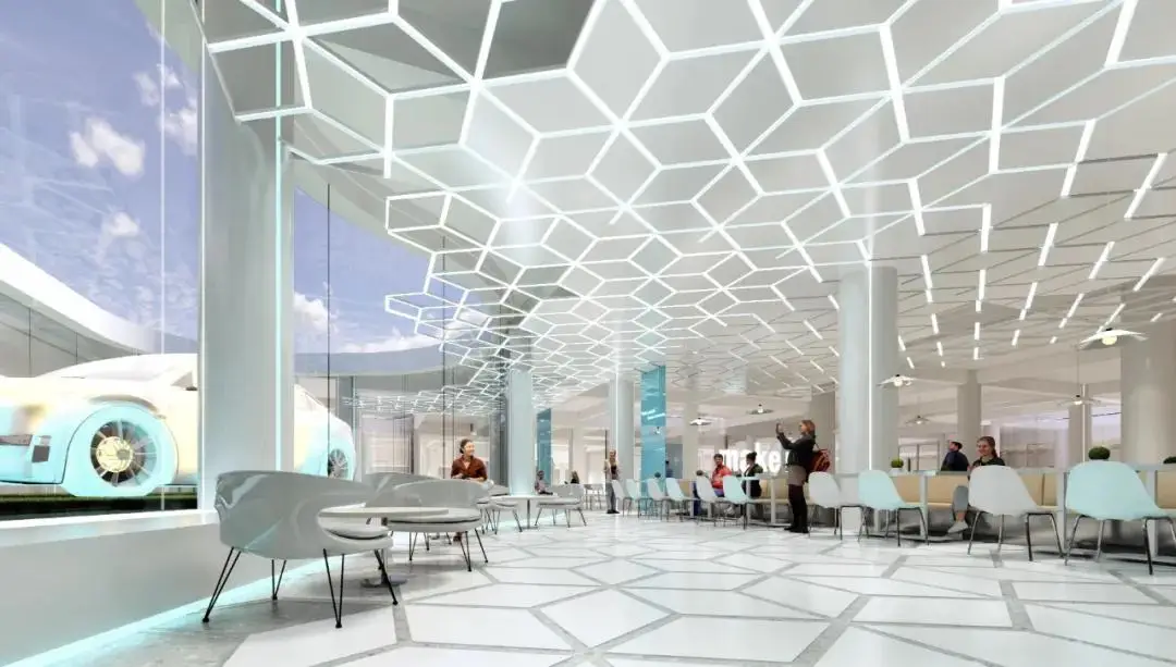 区别于传统厂房办公区给人拥挤、嘈杂、压抑,产业园室内设计注重人文关怀。员工餐厅作为未来展示空间,极具科技感,为其精英人才与卓越客户提供顶尖就餐环境,彰显了企业的人性化管理和前瞻视野。