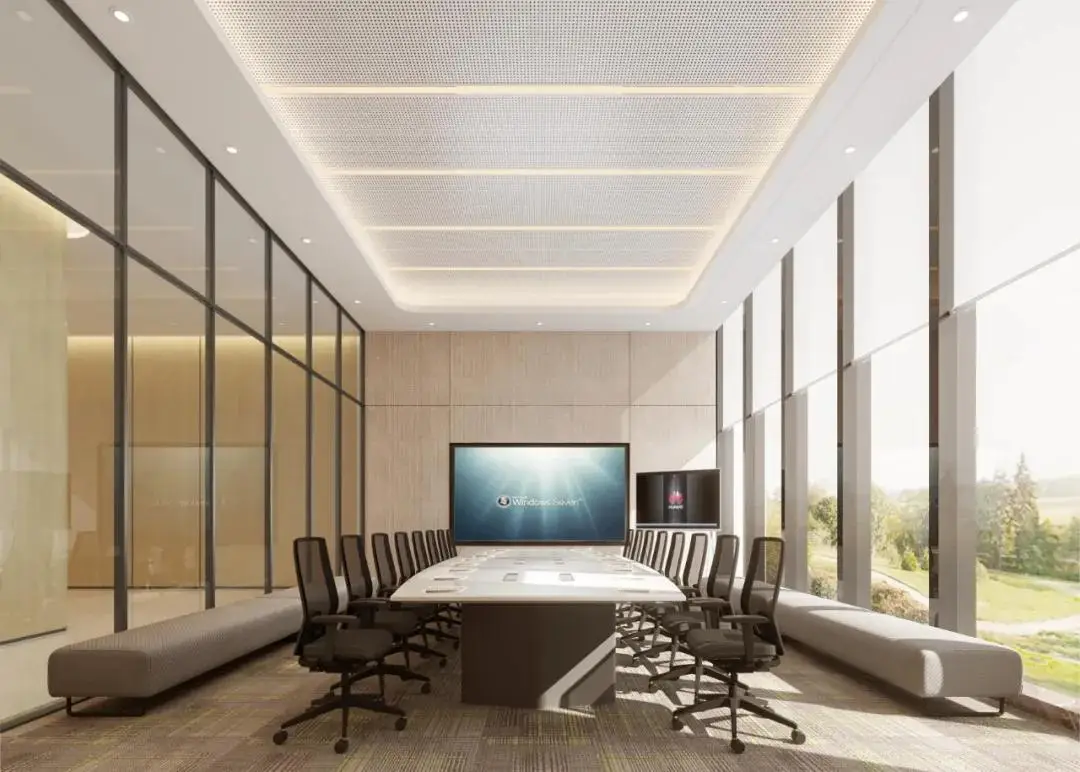 会议室以能源矩阵为主题,通过大面积的窗户,将室外的自然光引入室内,确保了足够的空间感。原木背景墙和质感地毯,给人温润与柔和的感觉。灯具的挑选同样注重实用与美观的结合,让员工在工作时不会感到压抑。