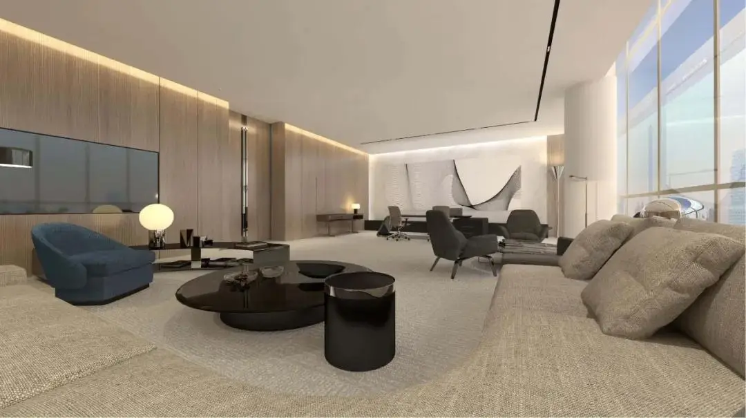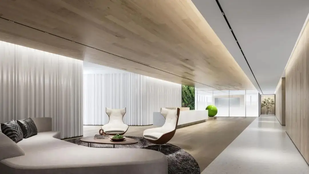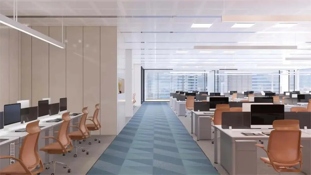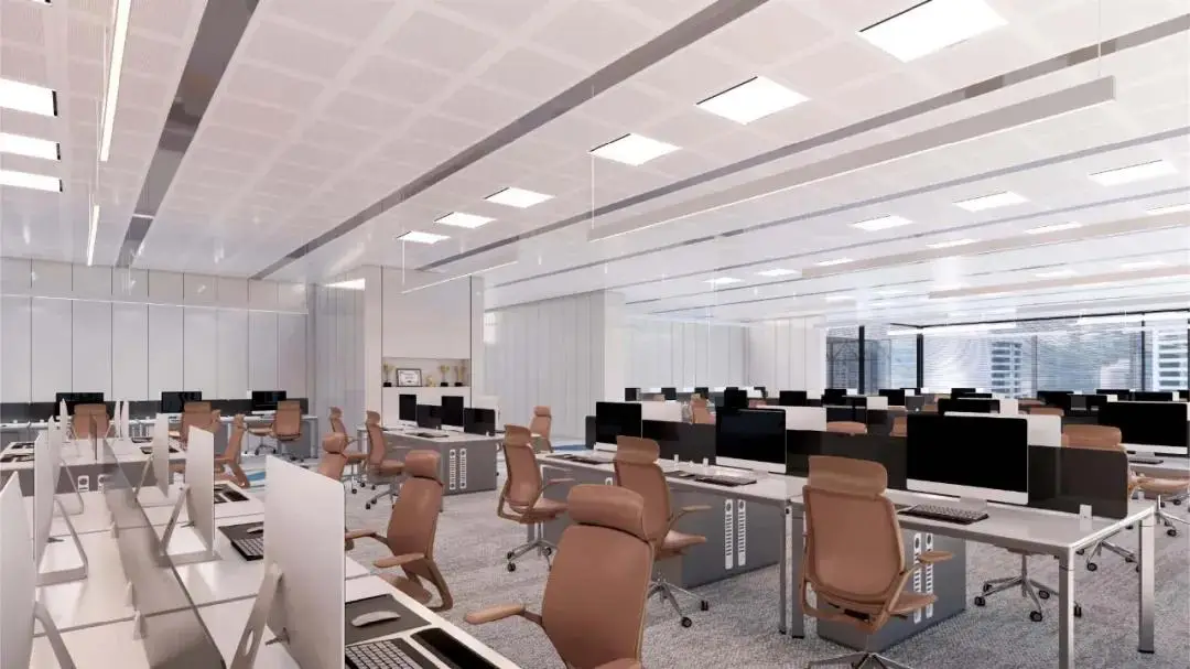办公区以智慧纽带为设计元素,以环境通透与采光为核心,采用现代简约的设计风格,运用大面积落地玻璃,打造明亮通透的办公环境。同时,我们注重动线规划、空间体验、可持续发展,创造了一个既满足工作需求又能激发创新思维的环境。