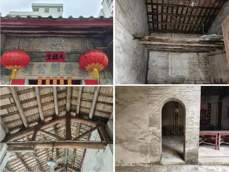 现状建筑保存状况较差,瓦面破损漏光渗水、木构件受潮腐朽开裂、墙体墙脚受潮青苔滋长、地面阶砖老化破损、建筑多处存在后期改造等情况,存在安全隐患;2011 年5 月,朝俊刘公祠被公布为白云区登记保护文物单位。