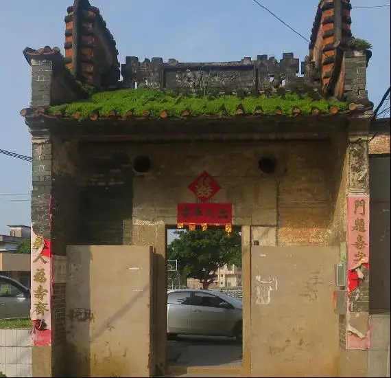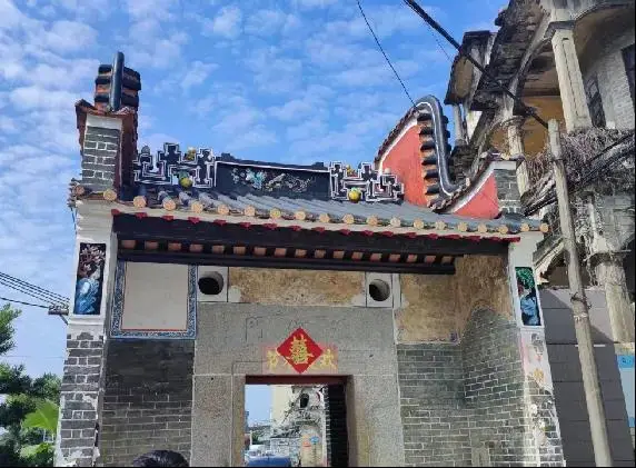 汇潮门始建于清光绪癸卯年(1903),1999 年重修,坐西朝东稍偏北,面阔 5 米(外墙面至外墙面),通进深 5.5 米(外墙面至外墙面),占地面积 27.6 平方米, 地面采用三合土材质,中间设甬道,为花岗岩石材;硬山顶,前廊内置卷棚顶,辘筒瓦面,博古脊,山墙搁檩式结构;两侧为镬耳山墙,青砖清水墙砖,墙楣施彩色 壁画;花岗岩石门框,石门匾阳刻“汇潮门”大字楷书,上款刻“光绪癸卯二月”, 下款刻“陈伯陶书”;封檐板施精美木雕,墀头上部饰灰塑图案。
