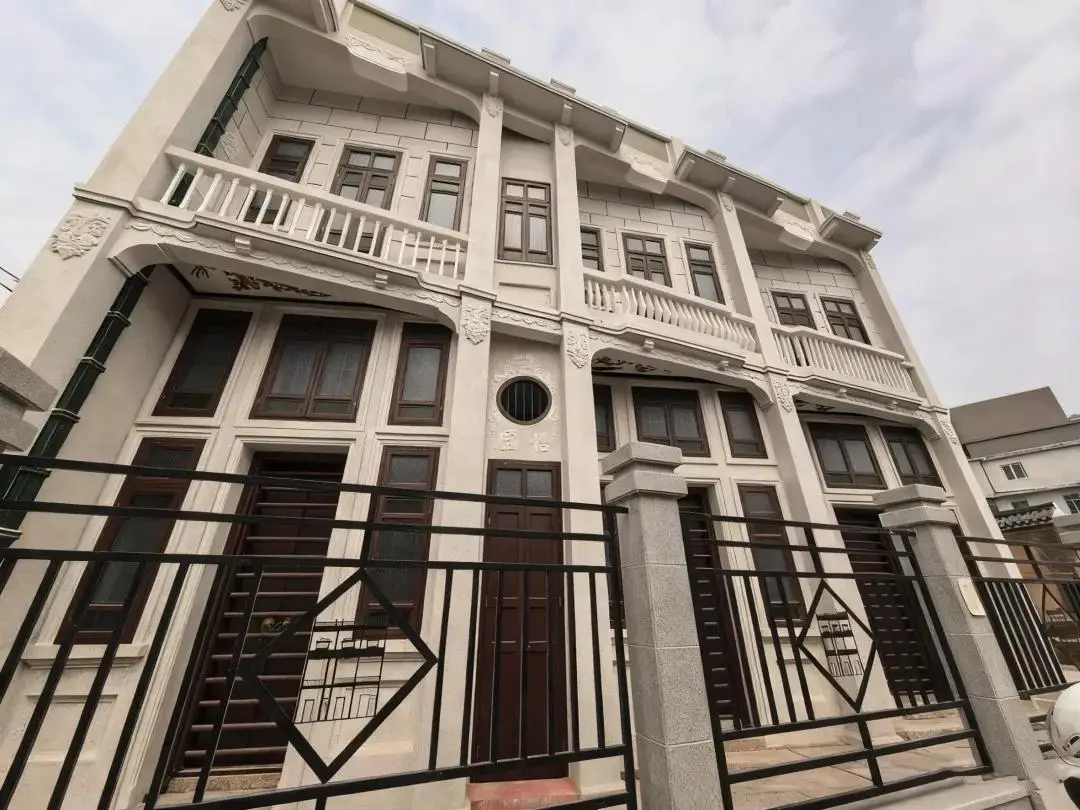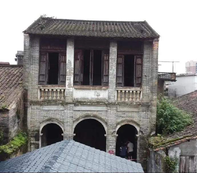 龙溪南首约民居住宅为两梯三栋连体式砖混结构建筑,中西合璧装饰风格。因顺街道走向,三栋建筑平面墙而成跌级内收形态,天台与阳台随之呈现三角状态。每栋南面设阳台,北面三层为两面坡屋顶房舍,西1栋、西2栋与东1栋平面呈错开式设置,三层屋面上前后檐皆设女儿墙,与山墙垂脊相连,屋脊以碌筒板瓦砌筑。每层单元均设前厅,并置采光通风口,厅后置木间隔板房,后墙设有采光通风天井。
